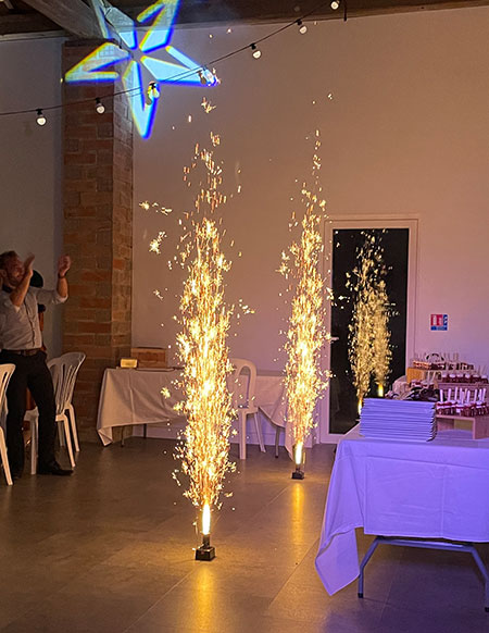Gerbes d’étincelles froides. Effets adaptés à l’entrée en salle, dessert ou l’ouverture du bal.